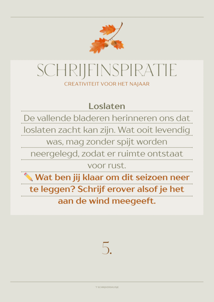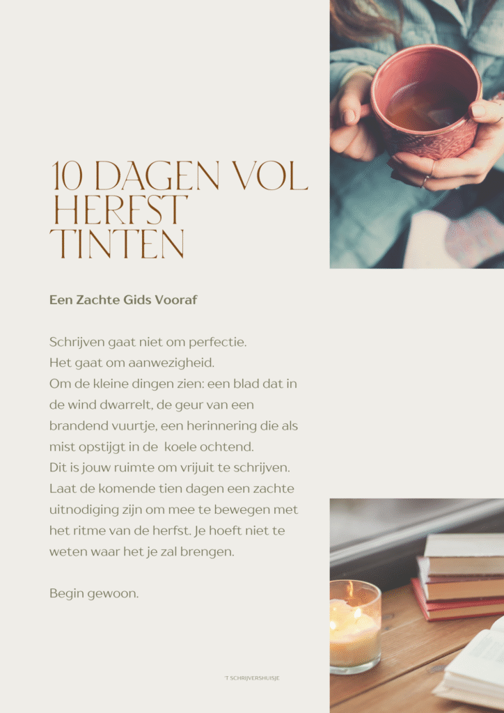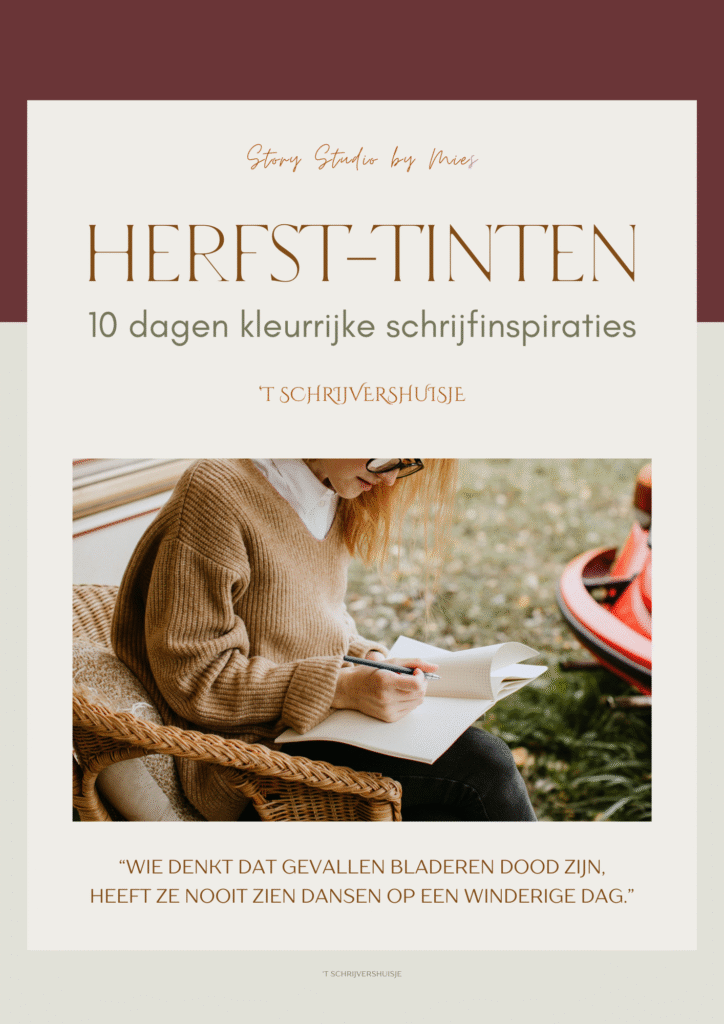 Wil je alvast zelf aan de slag met schrijven? Dat kan! Ik heb speciaal voor jou dit najaar een bundeltje vol schrijfinspiraties gemaakt. Het zal je schrijf-creativiteit minimaal 10 dagen lang volop inspireren! Het bundeltje is te koop voor € 9,99 en is direct online beschikbaar na aankoop. (PS. na aankoop geen terugbetaling mogelijk). Spijt ga je niet hebben!